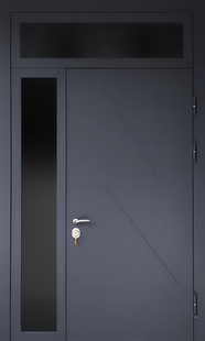 Входная термодверь с остекленной фрамугой, отбойником и синими панелями МДФ